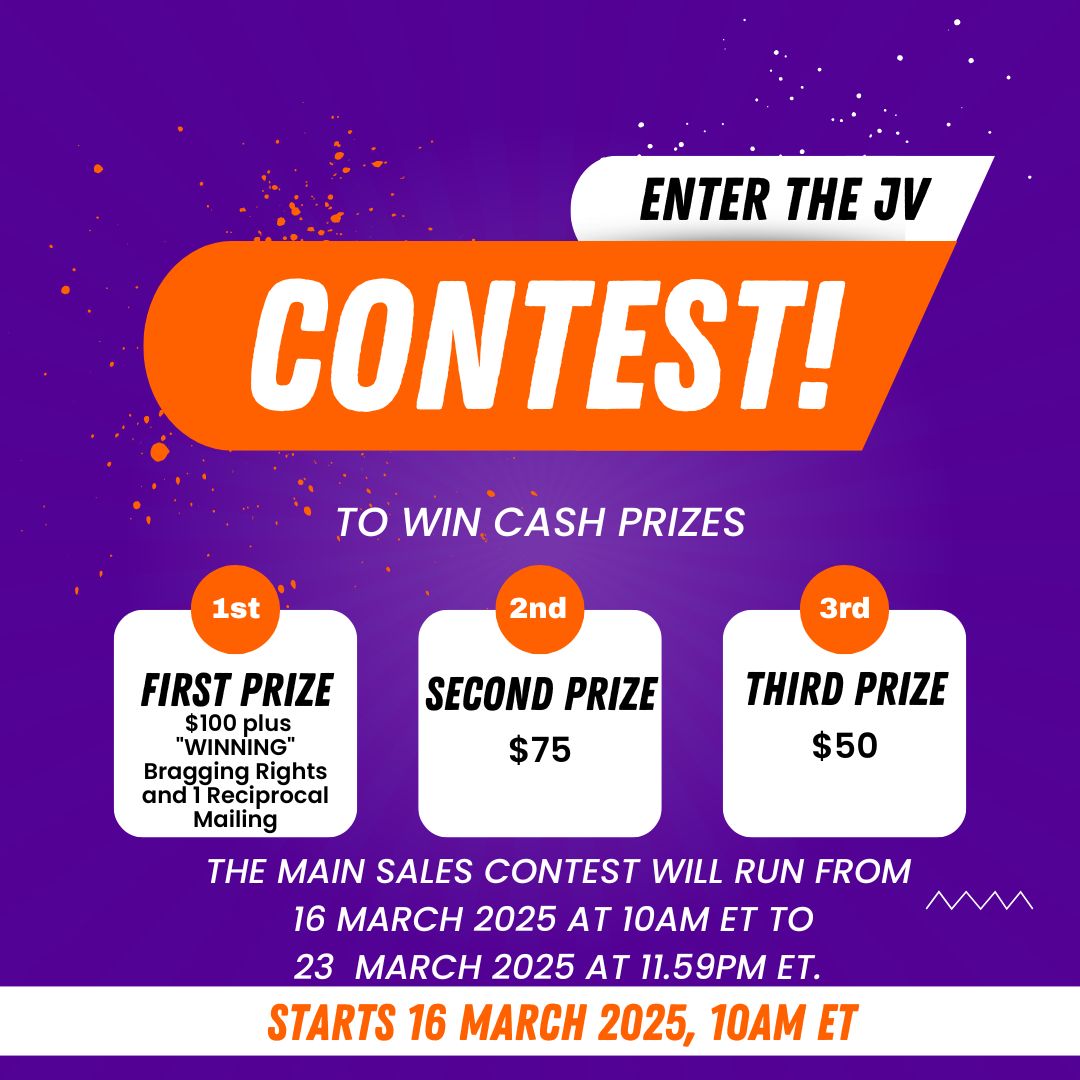 Important Contest Details: The official leader-board and overall contest ranking is based on overall sales during the contest period (March 16 2025 10am ET – March 23 2025 11.59pm). Minimum 20 front end sales required for prize payouts. For reciprocal mailings, you must have a product of sufficient quality to qualify.